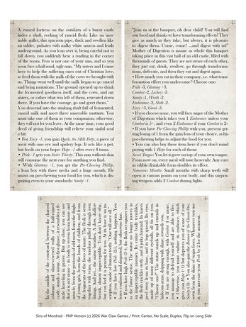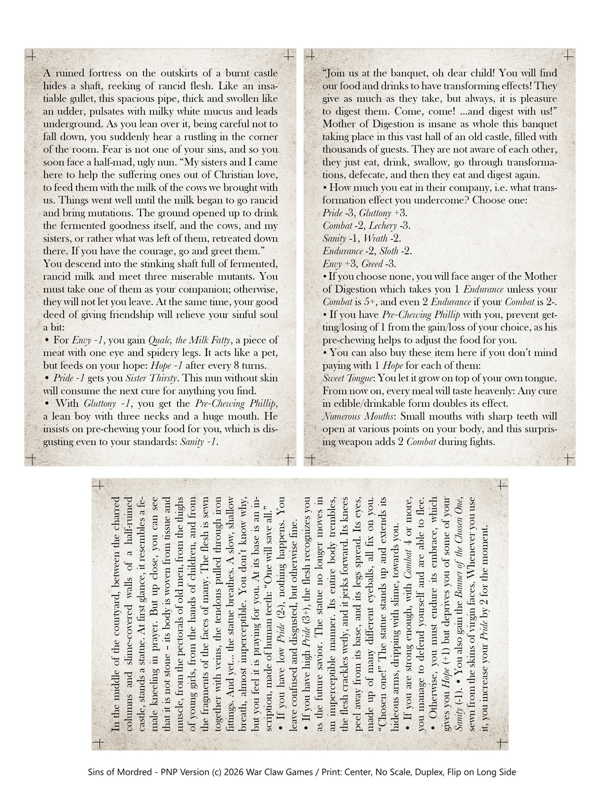 On your journey through the underworld, every turn, you choose from three cards with full-page illustrations: one to discard, one to put on the bottom of the deck, and one to play - to face the encounter hidden behind the illustration. Text on the flip side will tell you what happens – based on your current condition – and what changes you shall write into your character sheet. You will try to get rid of points of your “sins” during your journey.